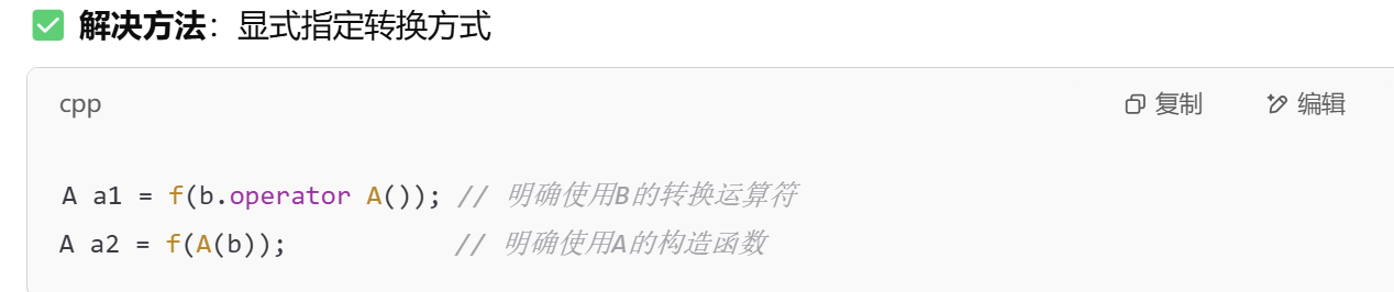 当类中包含类型转换时,必须确保在类类型和目标类型之间只有唯一的转换方式,否则编译器会不知道该选择哪个转换,导致二义性错误。