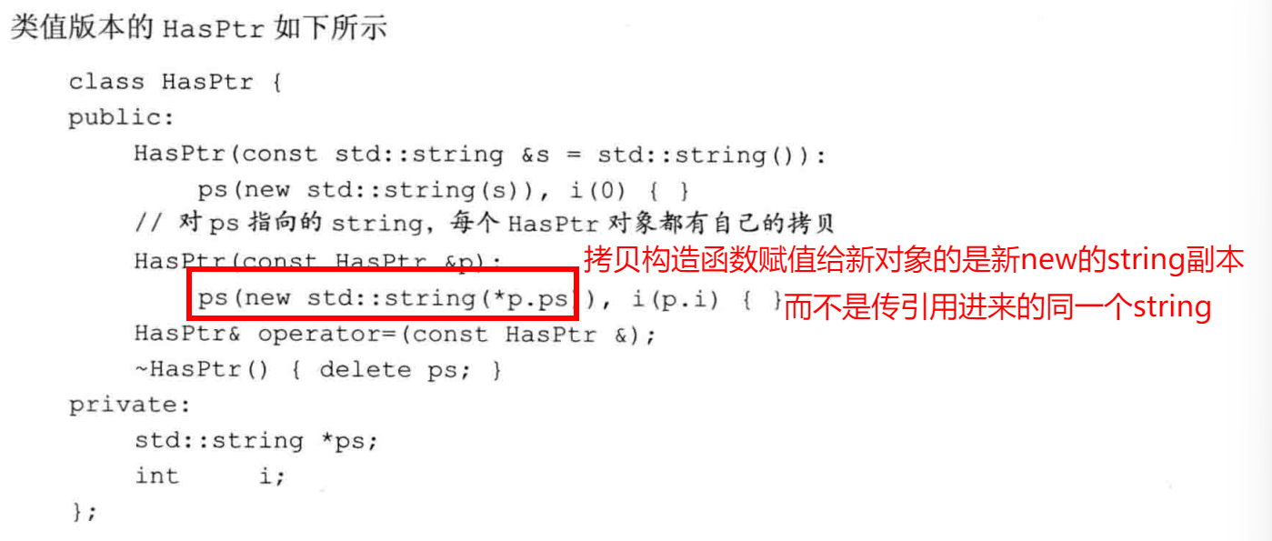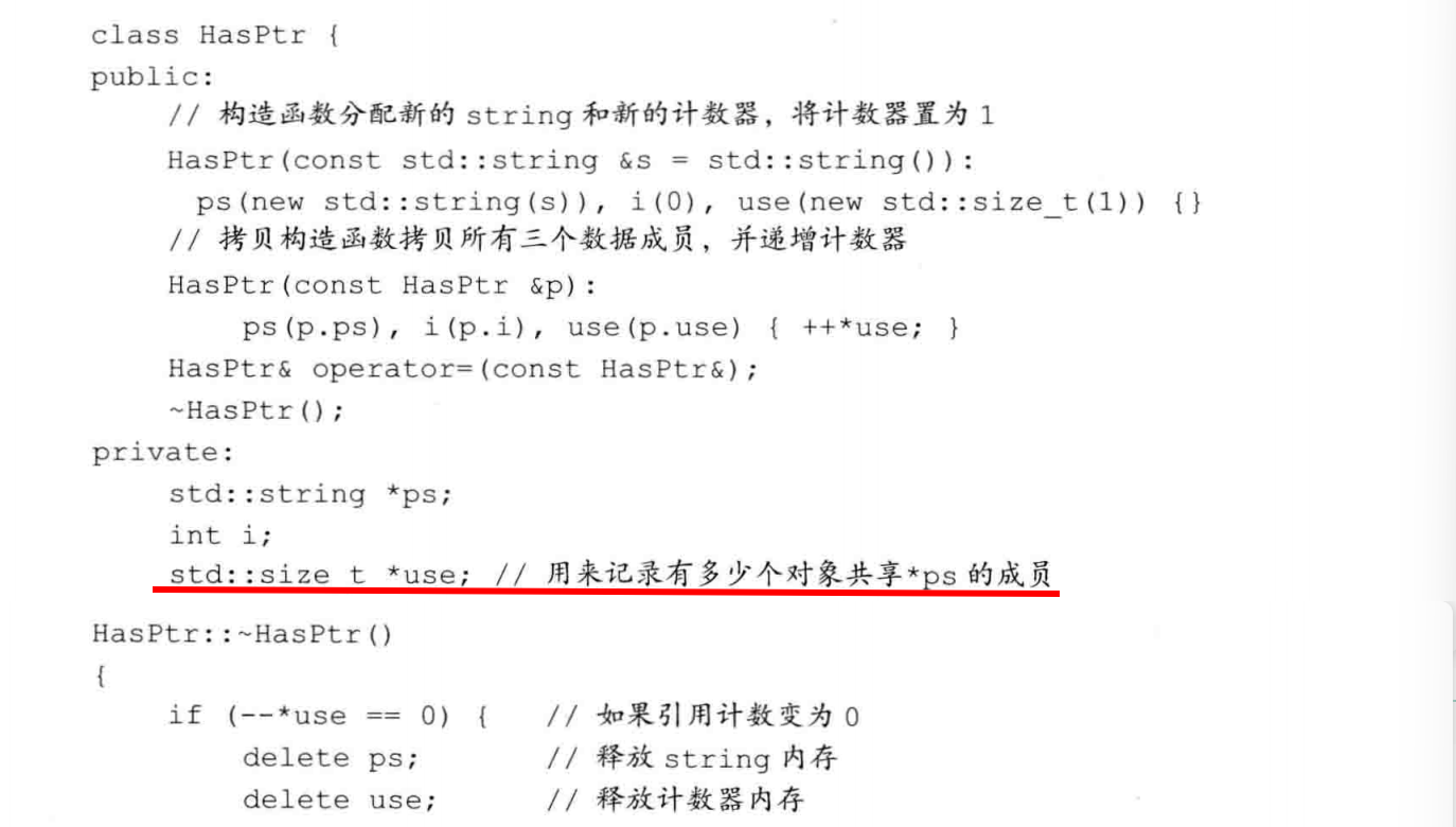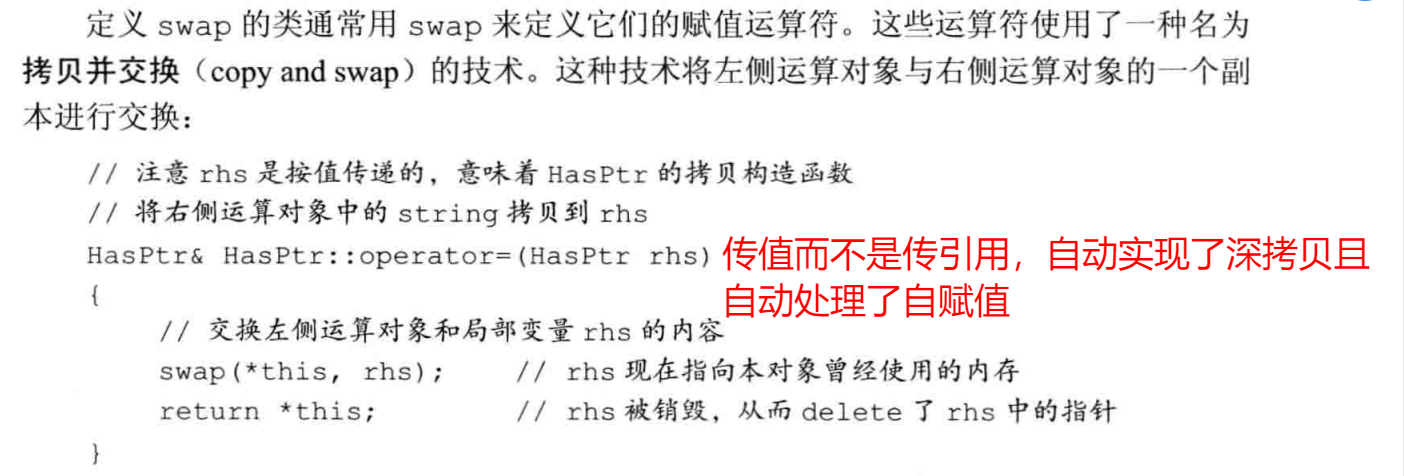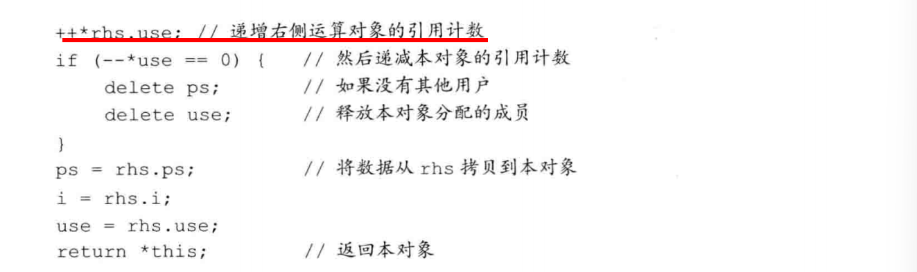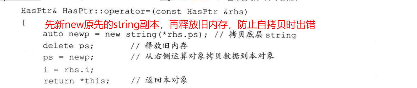 防范自赋值:如果rhs和本对象是同一个对象,delete ps会释放this和rhs指向的string。当我们在new表达式中试图拷贝(rhs.ps)时,就会访问一个指向无效内存的指针,其行为和结果是未定义的。